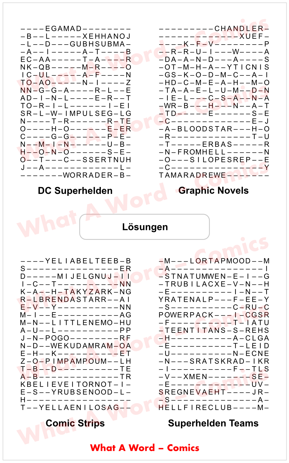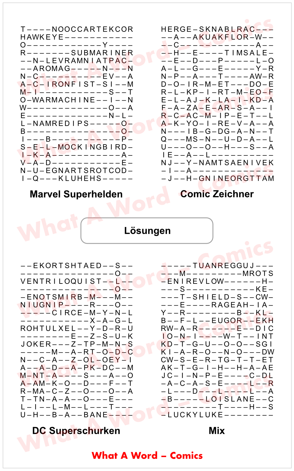 Mit mehr als 400 Begriffen zu den Themen Marvel Superhelden – Comiczeichner – DC Superschurken – Superhelden Teams – Micky Maus – DC Superhelden – Mangas – Marvel Superschurken – Asterix – Graphic Novels – Comic Strips – Die Peanuts – Superschurken Mix – Donald Duck – Mix. Mit interessanten Fakten und Illustrationen zum zählen und ausmalen.