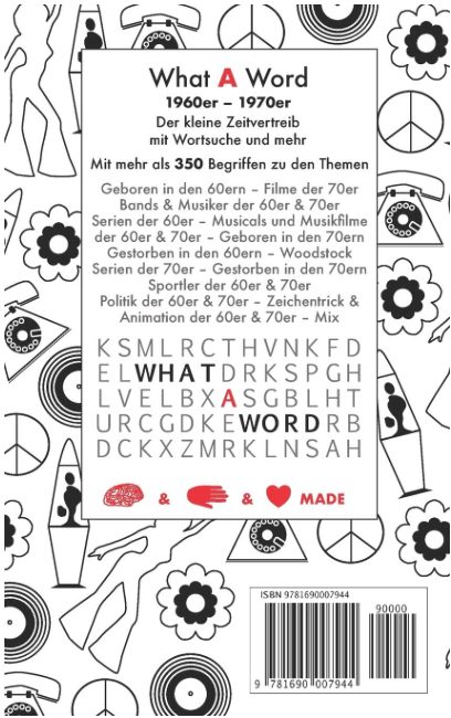 Mit mehr als 350 Begriffen zu den Themen Geboren in den 60ern – Filme der 70er – Bands & Musiker der 60er & 70er – Serien der 60er – Musicals und Musikfilme der 60er & 70er – Geboren in den 70ern – Gestorben in den 60ern – Woodstock – Serien der 70er – Gestorben in den 70ern – Sportler der 60er & 70er – Politik der 60er & 70er – Zeichentrick & Animation der 60er & 70er – Mix. Mit interessanten Fakten und Illustrationen zum zählen und ausmalen.