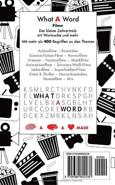 Mit mehr als 400 Begriffen zu den Themen Actionfilme – Komödien – Science-Fiction-Filme – Horrorfilme – Dramen – Fantasyfilme – Musikfilme – Animationsfilme – Schwarz-Weiß-Filme – Liebesfilme – Superhelden-Filme – Krimi & Thriller – Horrorkomödien – Stummfilme – Mix. Mit interessanten Fakten und Illustrationen zum zählen und ausmalen.