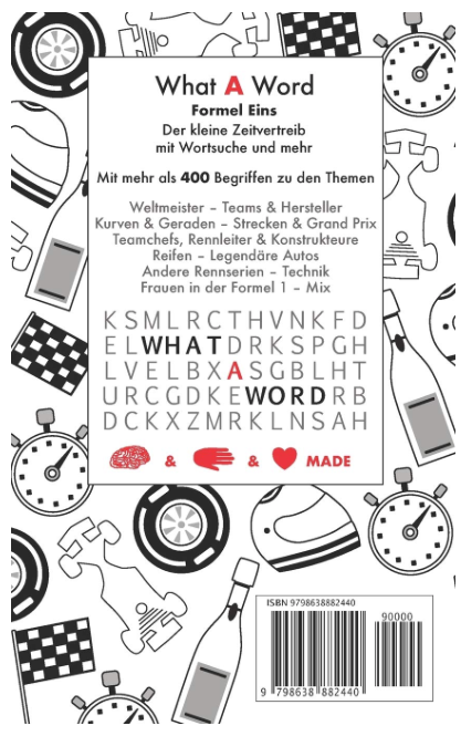 Mit mehr als 400 Begriffen zu den Themen Weltmeister – Teams & Hersteller – Kurven & Geraden – Strecken & Grand Prix – Teamchefs, Rennleiter & Konstrukteure Reifen – Legendäre Autos – Andere Rennserien – Technik – Frauen in der Formel 1 – Mix. Mit interessanten Fakten und Illustrationen zum zählen und ausmalen.