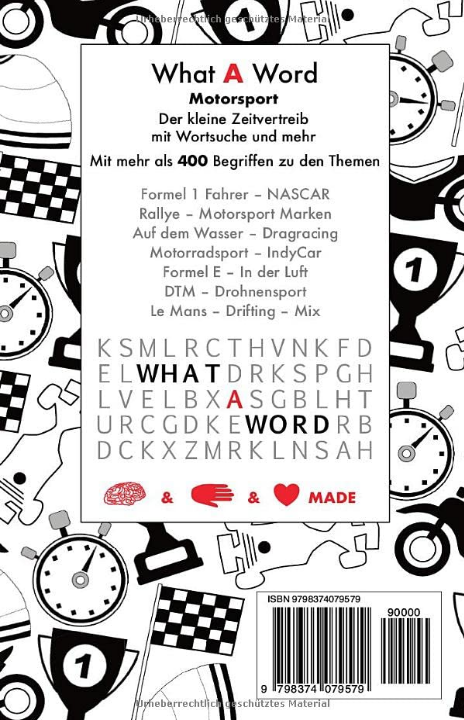Mit mehr als 400 Begriffen zu den Themen Formel 1 Fahrer – NASCAR – Rallye – Motorsport Marken – Auf dem Wasser – Dragracing – Motorradsport – IndyCar – Formel E – In der Luft – DTM – Drohnensport – Le Mans – Drifting – Mix. Mit interessanten Fakten und Illustrationen zum zählen und ausmalen.