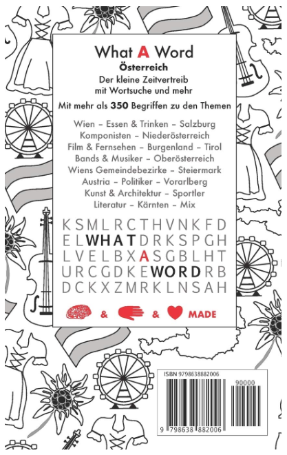 Mit mehr als 400 Begriffen zu den Themen Wien – Essen & Trinken – Salzburg Komponisten – Niederösterreich – Film & Fernsehen – Burgenland – Tirol Bands & Musiker – Oberösterreich – Wiens Gemeindebezirke – Steiermark Austria – Politiker – Vorarlberg – Kunst & Architektur – Sportler – Literatur – Kärnten – Mix. Mit interessanten Fakten und Illustrationen zum zählen und ausmalen.
