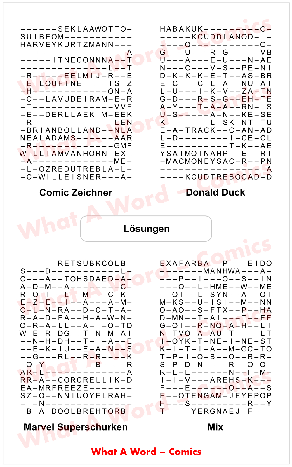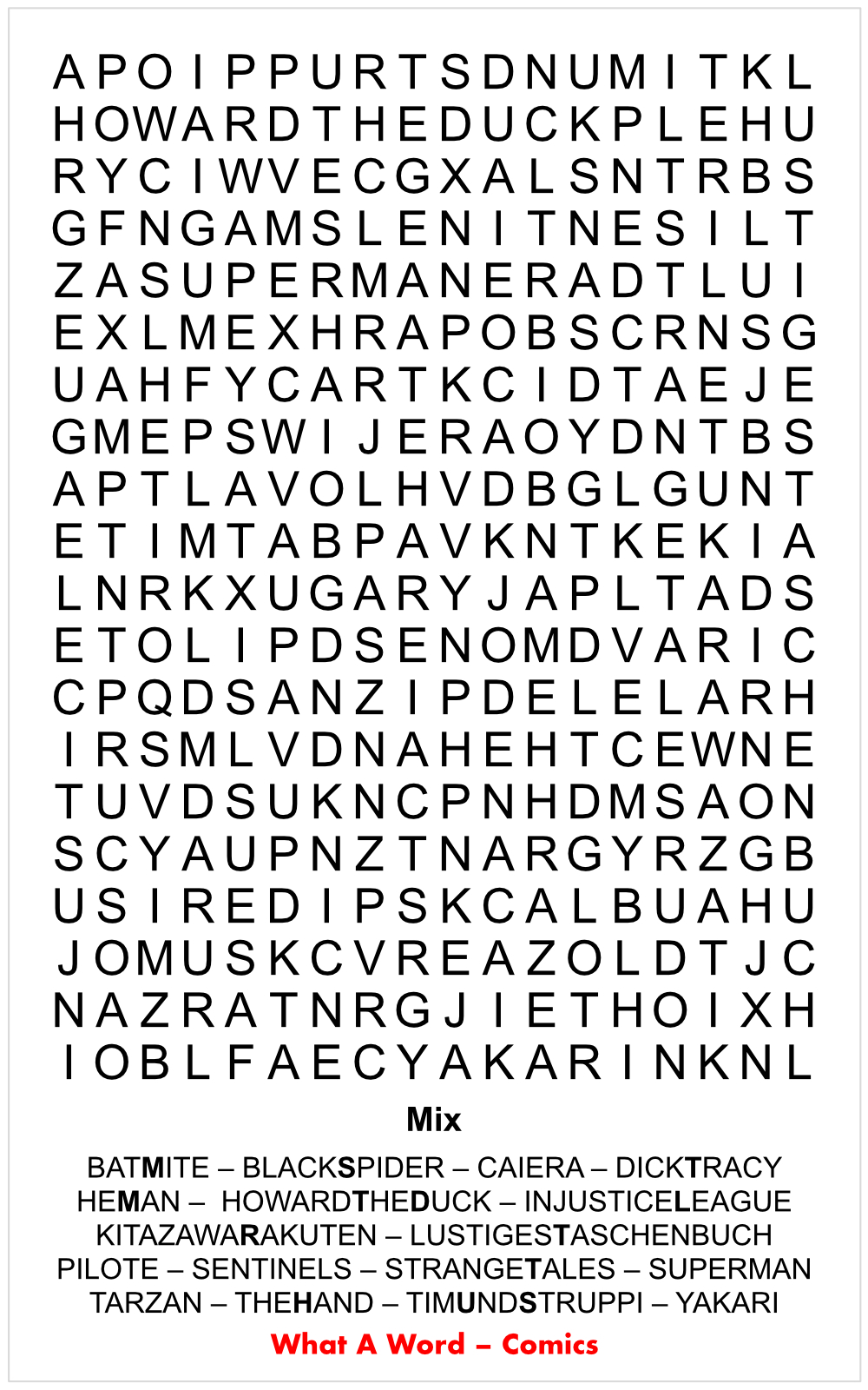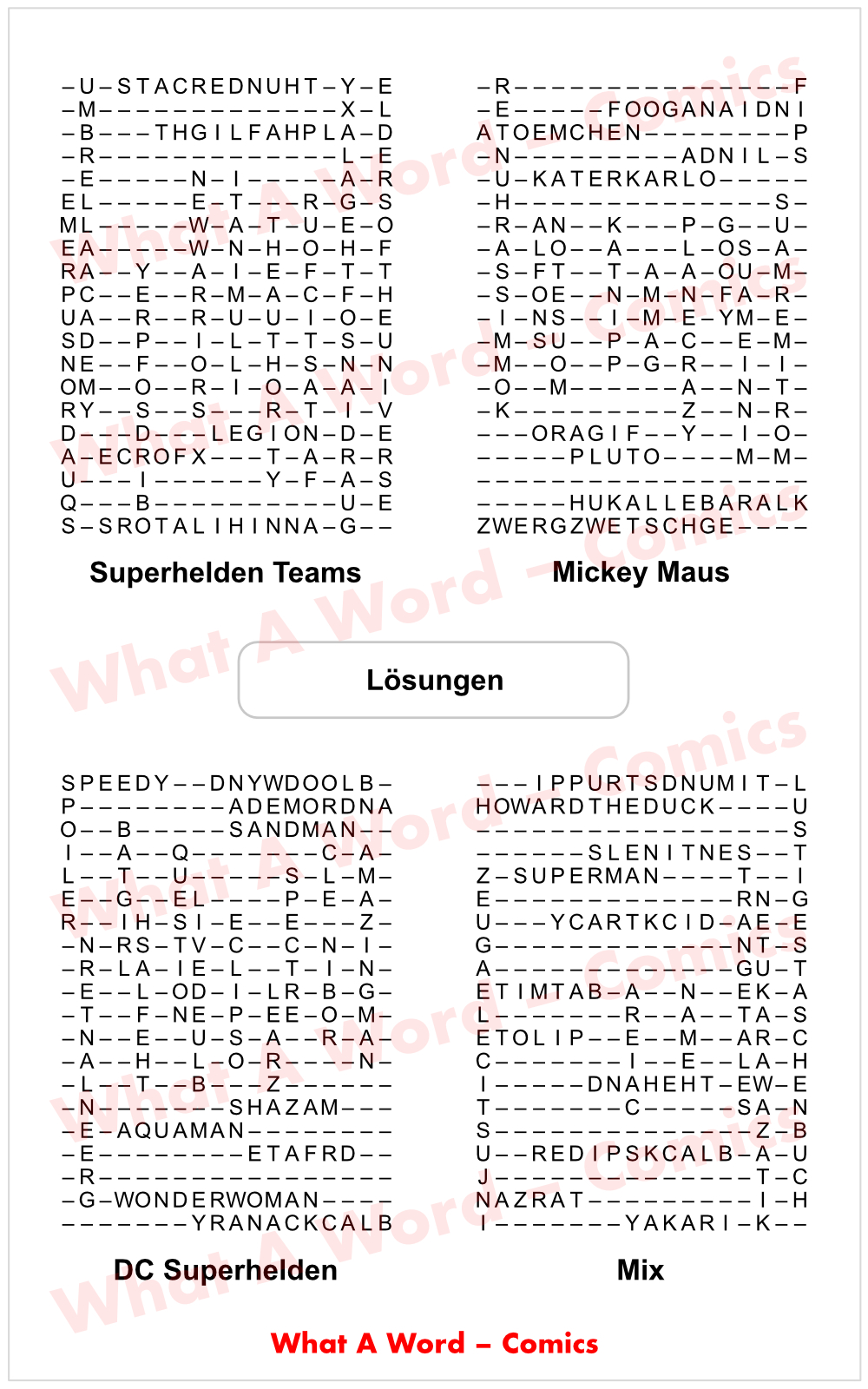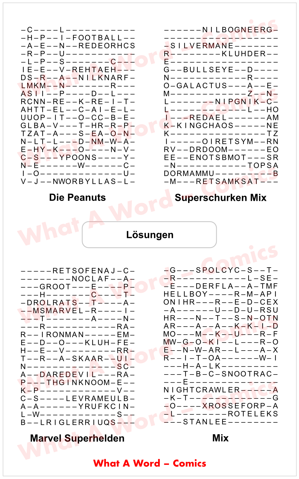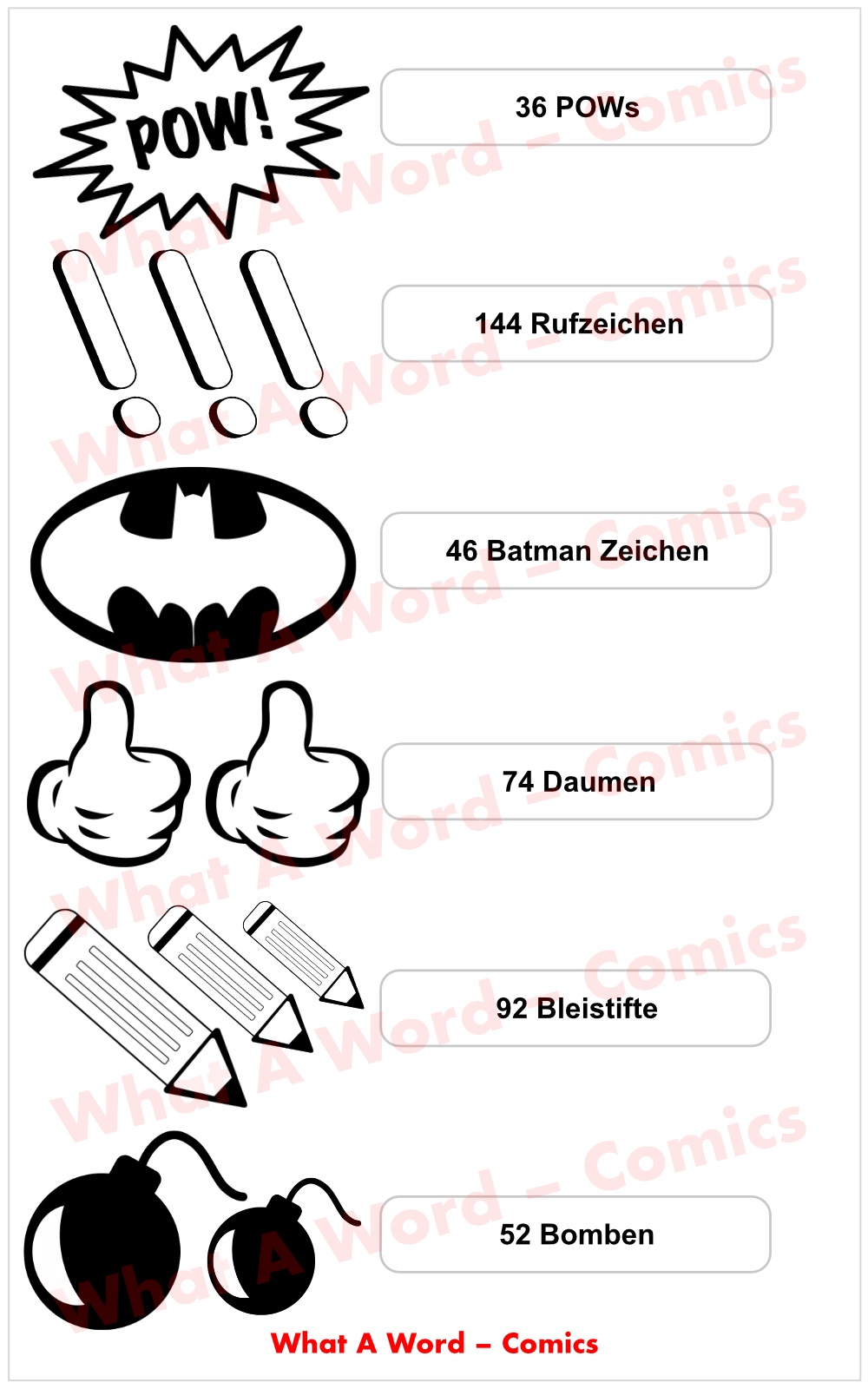 Mit mehr als 400 Begriffen zu den Themen Marvel Superhelden – Comiczeichner – DC Superschurken – Superhelden Teams – Micky Maus – DC Superhelden – Mangas – Marvel Superschurken – Asterix – Graphic Novels – Comic Strips – Die Peanuts – Superschurken Mix – Donald Duck – Mix. Mit interessanten Fakten und Illustrationen zum zählen und ausmalen.